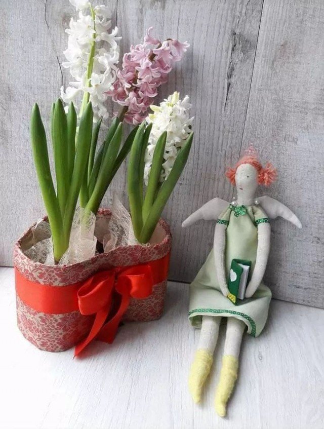 Для наповнення ляльок використовую холофайбер – синтетичне неткане полотно універсального застосування, яке виготовляють з поліестеру, формуючи особливе за формою волокно (скручене спіраллю і порожнє всередині). Кожна така нитка спаюєтся з сусідньою під впливом температурної обробки, і на виході – пружний, пористий, однорідний матеріал, який має такі властивості. Іграшки, наповнені холофайбером, не провокують алергії, тому їх без остраху можна давати дітям. А для «тіла» самого виробу можна використовувати практично будь-яку тканину: і шкіру, і оббивку для диванів, ситець, бавовну тощо.