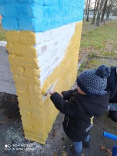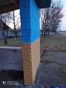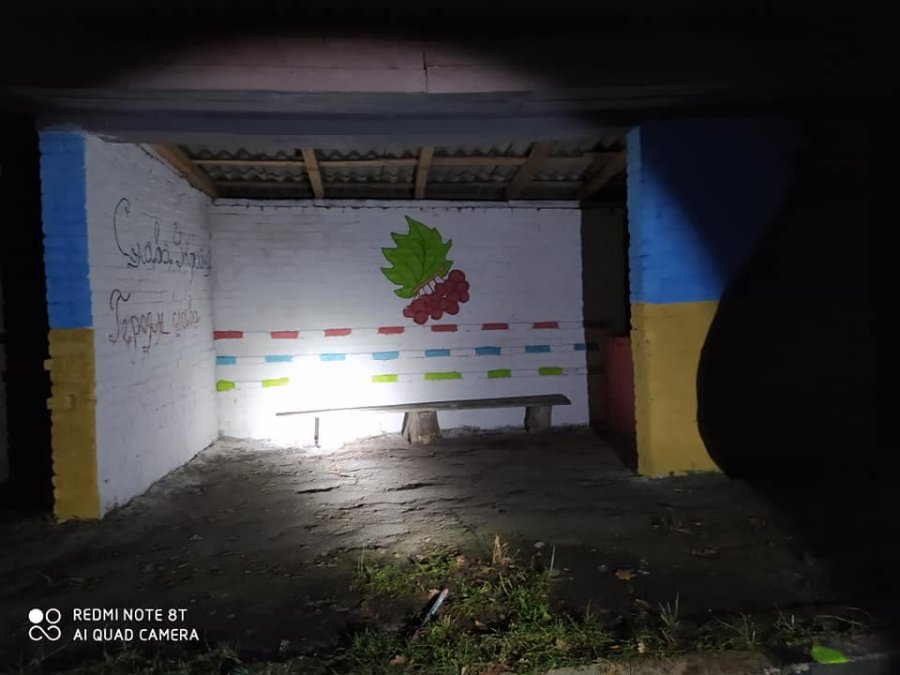 Одну стіну автобусної зупинки розфарбували у синьо-жовті кольори. На ще одній написали «Слава Україні! Героям слава!». А ще на іншій намалювали символ України – калину.