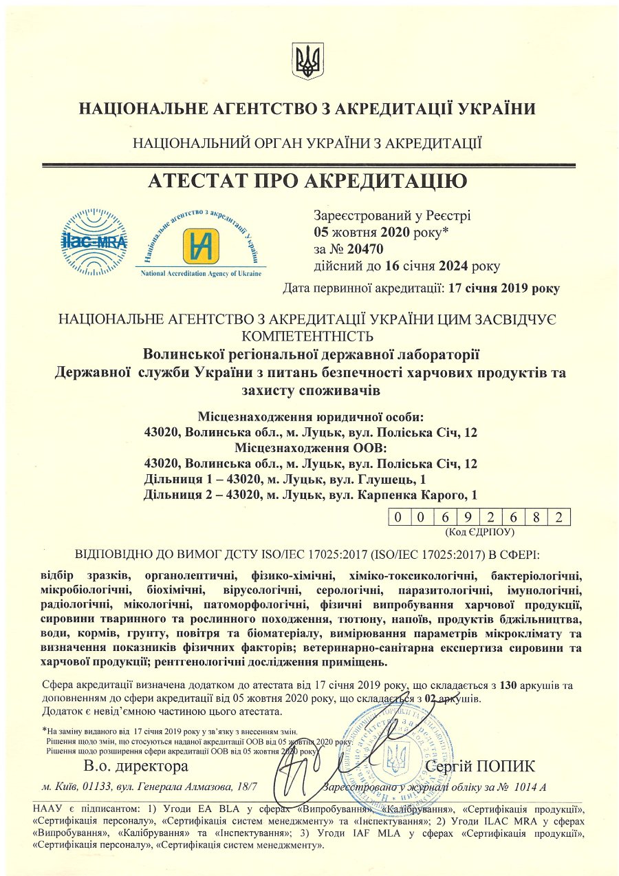 Згідно листа Держпродспоживслужби від 04.11.2020 року №11.1.1-17/2/16711, Волинською регіональною державною лабораторією Державної служби України з питань безпечності харчових продуктів та захисту споживачів підтверджено відповідності критеріям уповноваження та отримано доповнення до уповноваження для цілей державного контролю.