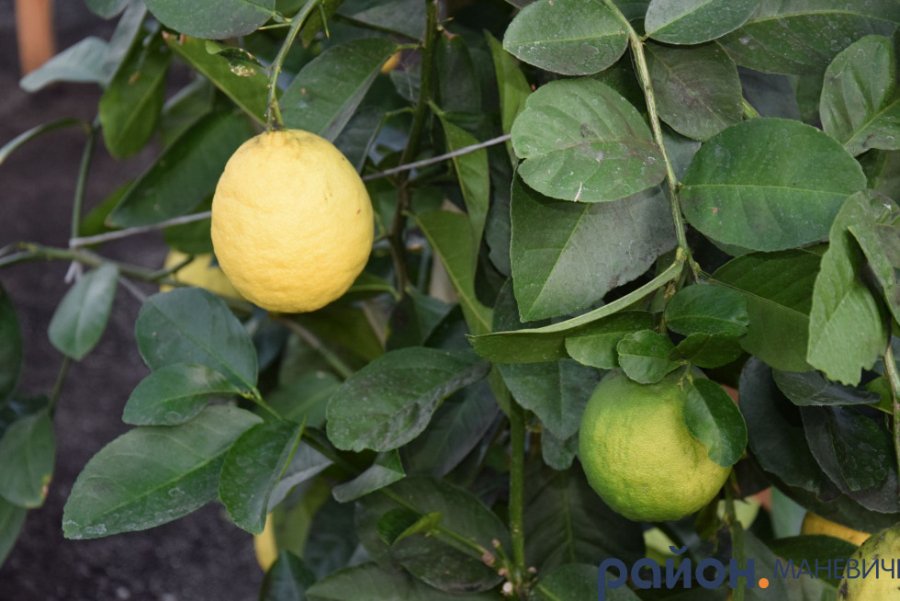 Лимони сорту Пандероза у теплиці державного підприємства «Маневицьке лісове господарство» на завершальній стадії дозрівання.