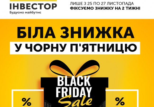 Кожен клієнт, який завітає до відділу продажів Будівельної компанії «Інвестор» із 25 до 27 листопада, отримає знижку з нагоди традиційного всесвітнього розпродажу, відомого як «чорна п’ятниця».