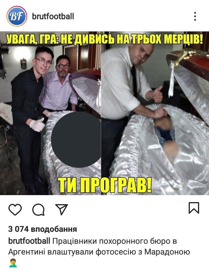 Також у спільноті "Брутальний футбол" в інстаграмі опублікована ще одна фотографія, де біля труни, схожої до труни Марадони, стоять ще двоє чоловіків.