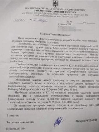 Жителька Нововолинська Тетяна Куценко вже 8 років живе з раком молочної залози 4 стадії. Жінка потребує дороговартістних ліків, які має приймати пожиттєво. Препапарат, який стримує розвиток хвороби – таргент «Ібранс». Проте нещодавно їй повідомили у Міністерстві охорони здоров’я, що держава більше не буде закуповувати цей препарат.