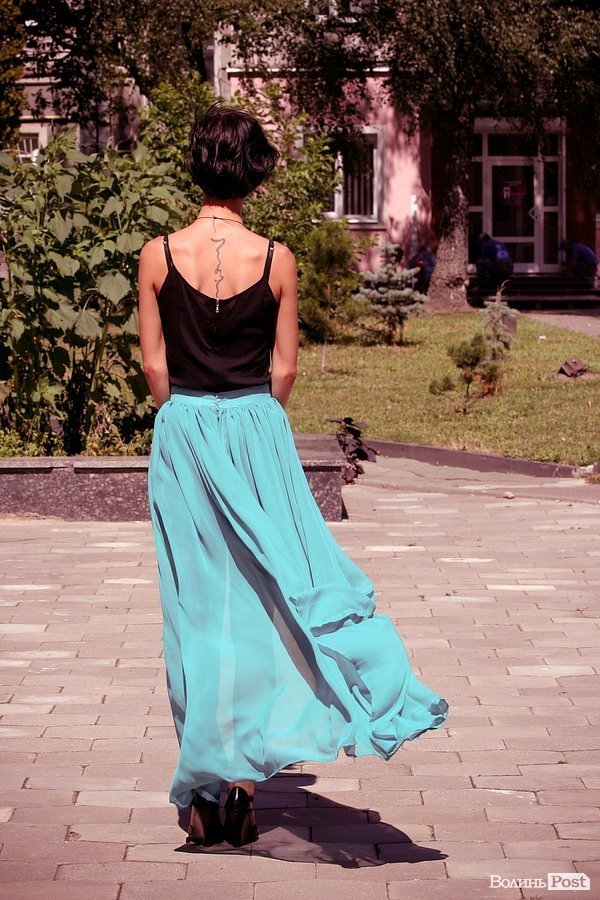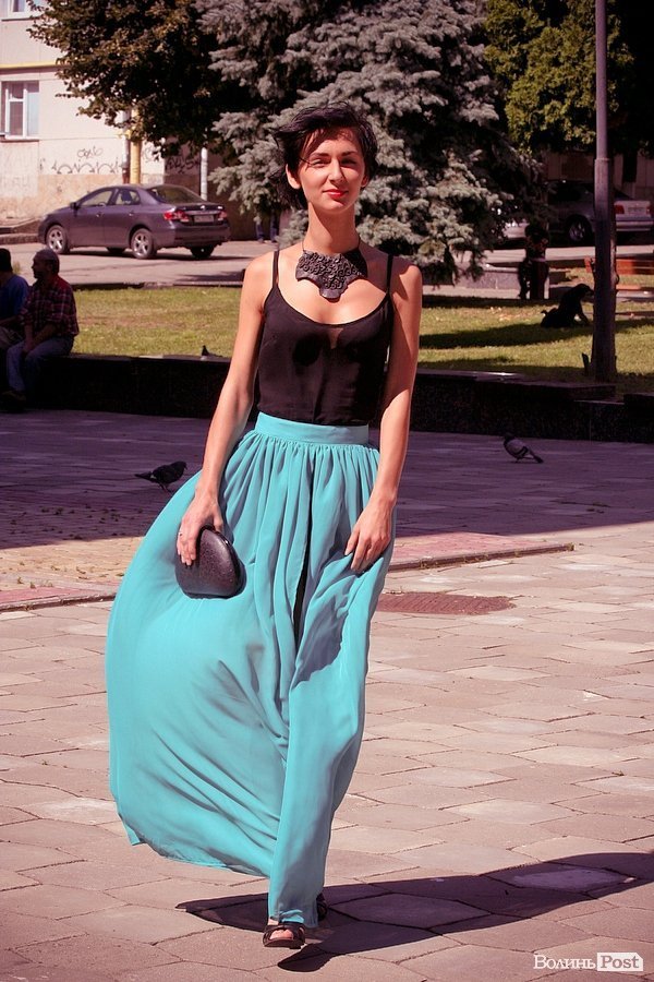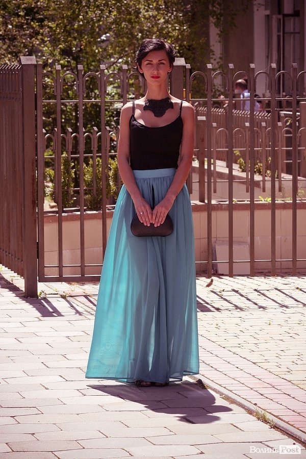 Вбрання Ліни - це поєднання лише двох кольорів. Чорна сукня та довга шифонова спідниця бірюзового кольору. Завдяки цьому вбранню дівчина виглядає елегантно, жіночно та вишукано. А легка спідниця - саме те, що дозволить відчувати себе комфортно у спекотний літній день.