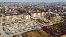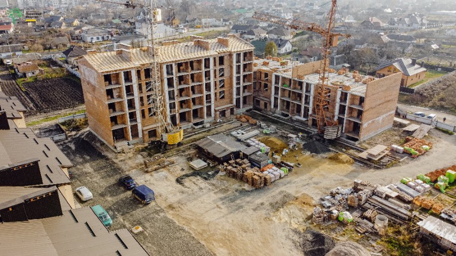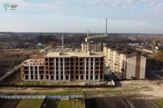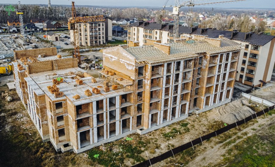 Наразі тут уже облаштовують дах над першими двома під’їздами та планують монтаж вікон. На 3 і 4 під’їздах перекрили третій поверх і почали мурувати четвертий.
