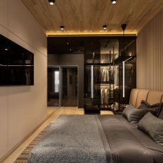 З інших оригінальний рішень – скляний гардероб в спальні. Завдяки напівпрозорим стінам має стильний вигляд, а у порівнянні із звичайною шафою – більш місткий та зручний у користуванні.