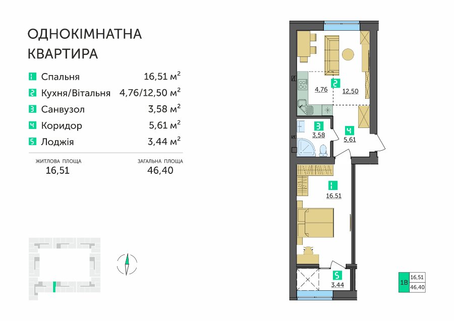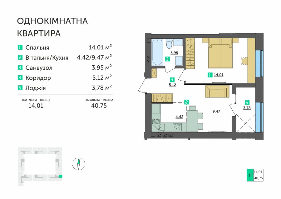 Є вісім різних видів планувань 1-кімнатних квартир в “Амстердамі”. Усі вони відрізняються і площею (від 40 до 46 м2), і різним підходом до організації простору.