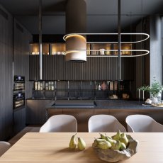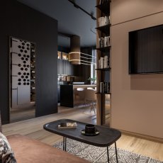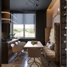 У проекті квартири була запланована кухня-вітальня, проте дизайнери запропонували інше рішення. Завдяки великій площі коридору, встановили зону відпочинку із диваном та телевізором там. А на місці, де мала б бути вітальня, облаштували їдальню з великим столом та спеціальною шафою для зберігання вин. Кажуть, клієнти все частіше просять додати такий елемент інтер’єру.