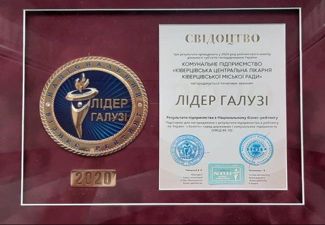 За підсумками проведеного незалежного аналізу фінансово-господарської діяльності серед 1 206 902 підприємств України медзаклад отримав відзнаку "ЛІДЕР ГАЛУЗІ 2020" в номінації "Коефіцієнт оборотності активів".