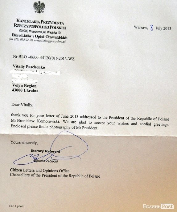 Юний лучанин Віталій Пащенко написав листа президенту Польщі Броніславу Коморовському й отримав відповідь.