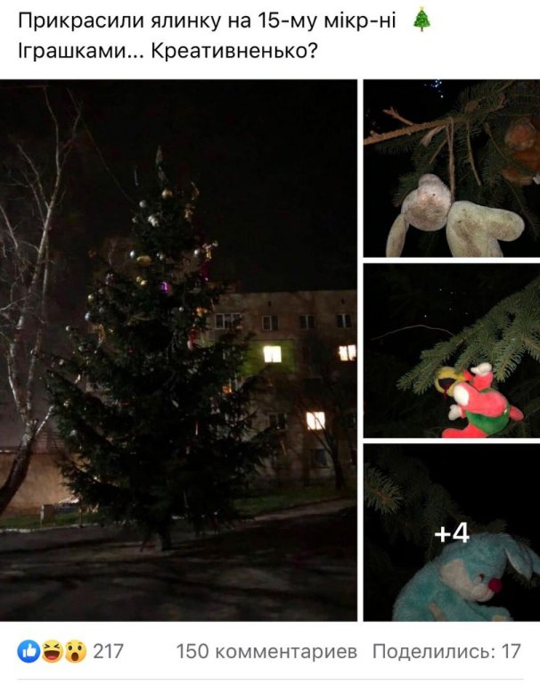 16-го грудня у фейсбуці в групі «Нововолинськ інфо» показали фото, як прикрасили ялинку на 15-му мікрорайоні в Нововолинську. Мешканці міста негативно зреагували на повішені на дерево м’які дитячі іграшки, пише БУГ.