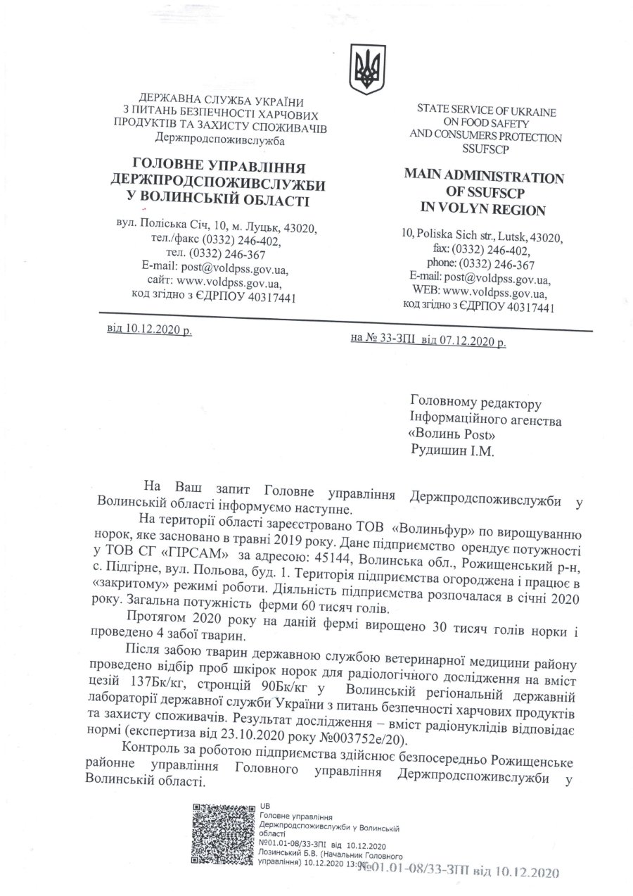 Наразі ж обласне управління Держпродспоживслужби переконує лише, що перед завезенням норок на підприємстві перевірили дотримання норм законодавства у сфері ветеринарної медицини. Порушень, переконують, не виявили. А вже пiсля забою тварин здійснили відбір проб шкірок норок для радiологiчного дослiдження на вміст цезію та стронцію Результат дослiдження – вміст радiонуклiдiв вiдповiдає нормі (експертиза від 23 жовтня 2020 року).
