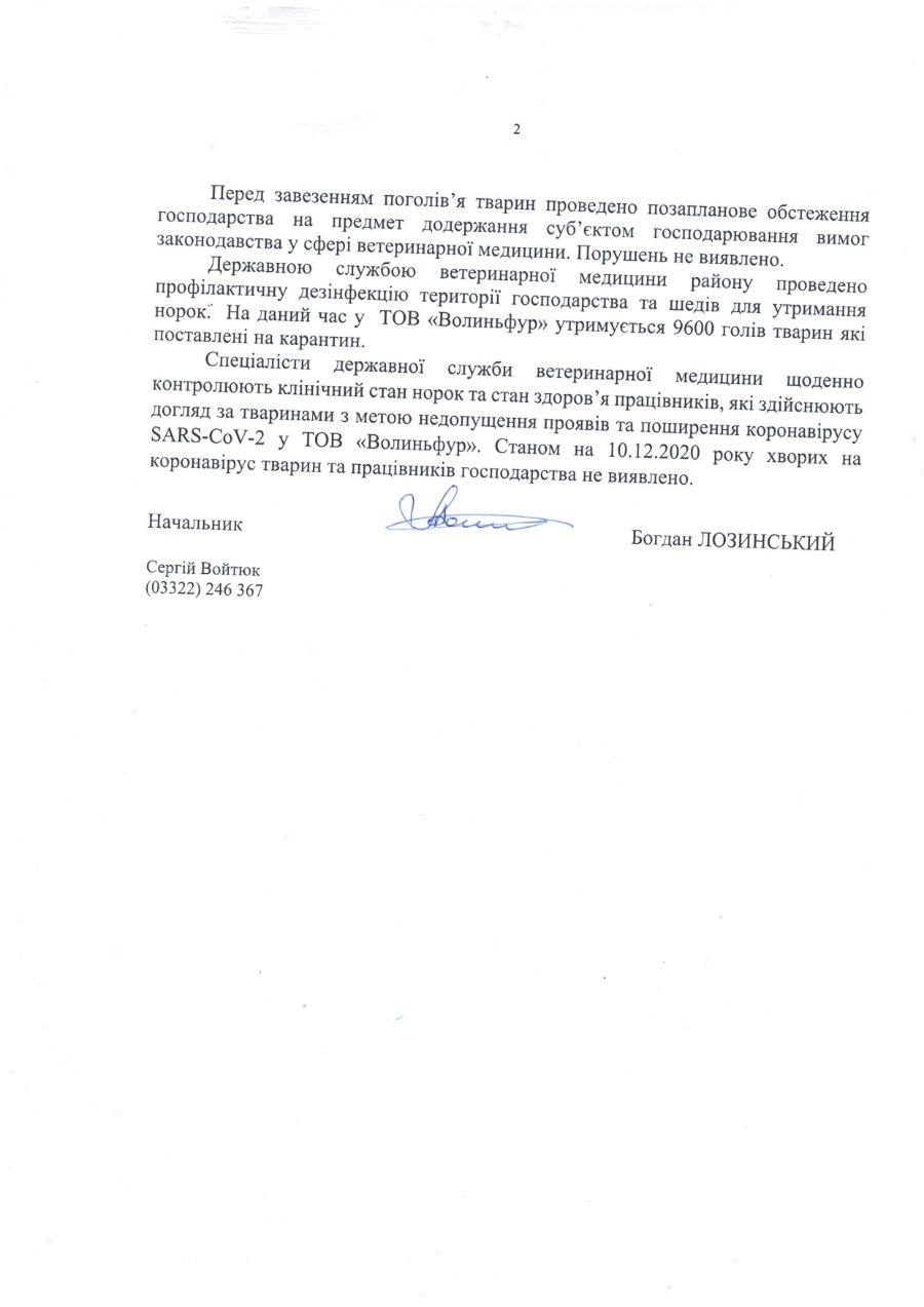 У Держпродспоживслужбі також додали, що щоденно контролюють «клінічний стан норок та стан здоров’я працівників, які здійснюють догляд за тваринами, з метою недопущення проявів та поширення коронавірусу у ТОВ «ВОЛИНЬФУР»». Станом на 10 грудня хворих на коронавірус тварин та працівників господарства не виявлено».