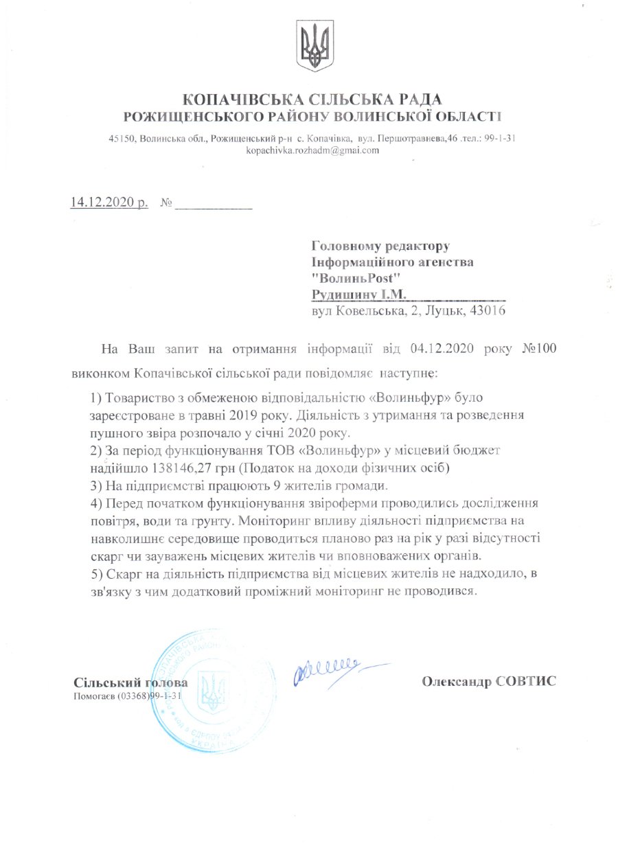 Зрештою, за декілька днів після візиту отримуємо відповідь на запит. У ньому, зокрема, йдеться про те, що за період функціонування ТОВ «ВОЛИНЬФУР» у місцевий бюджет надійшло 138 тисяч 146 гривень 27 копійок. Нагадаємо, що у січні буде рік, як функціонує норкова ферма. У сільраді переконують, що на фермі працюють 9 місцевих жителів.