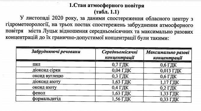 Перевищення середньомісячних концентрацій забруднюючих речовин у повітрі Луцька у листопаді цього року зафіксували за трьома показниками – діоксид азоту, фенол та формальдегід.
