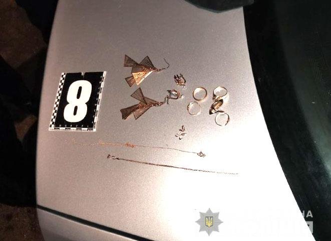 Під час огляду транспортного засобу в салоні поліцейські виявили та вилучили відмички та набори інструментів, які використовувалися у злочинній діяльності, грошові кошти в сумі 100 100 гривень, 105 доларів США, 25 євро та 10 найменувань ювелірних виробів.