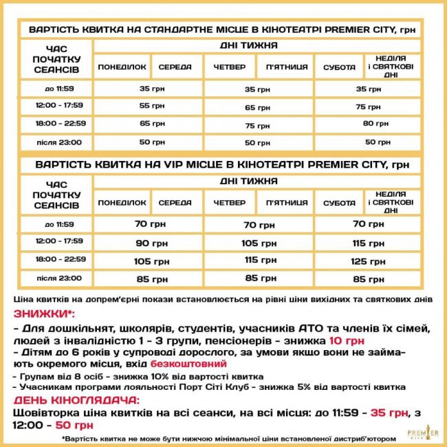 У кінотеатрі «PremierCity» діють знижки на квитки у кіно.