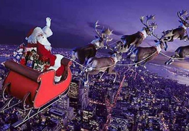 Санта-Клаус подорожує на санях, запряжених дев'ятьма оленями. Він упродовж доби має облетіти всю Землю.