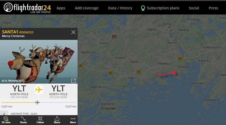 Маршрут Санти у режимі онлайн показує спеціальний сайт Norad Tracks Santa, який створений Командуванням повітряно-космічної оборони Північної Америки, та flightradar24.