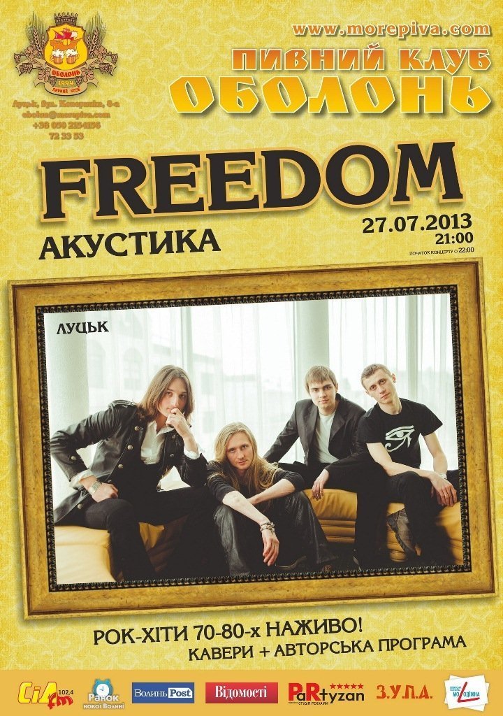 «FREEDOM ‒ це кавери на легендарні композиції таких монстрів рок-музики як Elvis Presley, Cinderella, Tito & Tarantula, Robert Plant, Ozzy Osbourne, Bon Jovi, Led Zeppelin та ін., а також авторська музика. Цієї суботи хлопці подарують Вам акустичну версію своєї програми, яка, надіємось, прийдеться Вам до смаку», ‒ йдеться в повідомленні.