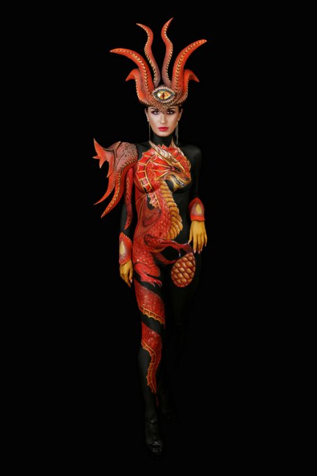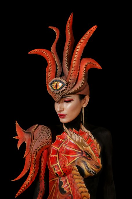 По тілу малює аквагримом і художніми пензлями. І навчилася робити бутафорію і прикраси, тому що не могла знайти того, що підійде для образу.