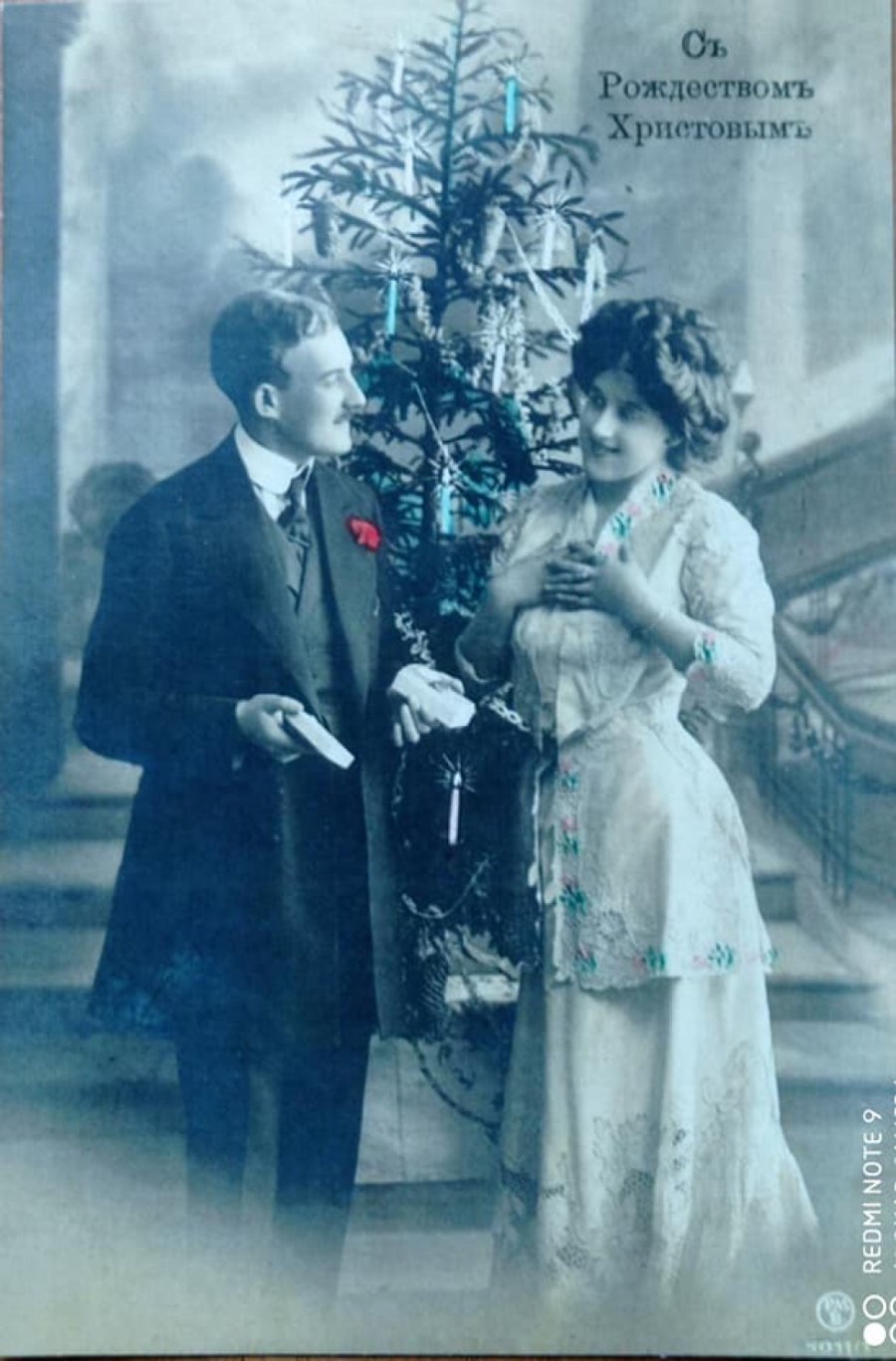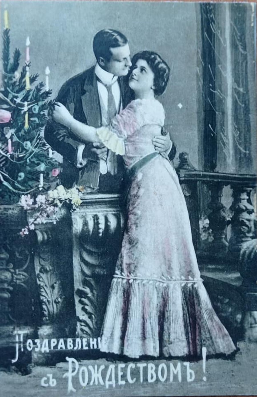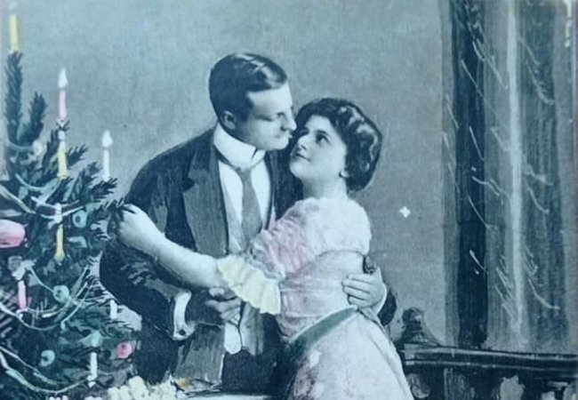 На різдвяних листівках початку XX століття майже завжди зображували ялинку, подарунки, дітей і закоханих.