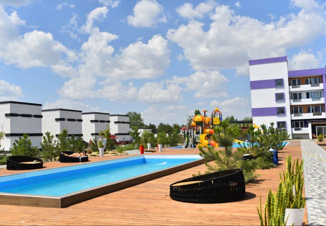 • Міні-аквапарк з гірками, а також великий загальний басейн з шезлонгами та парасольками;