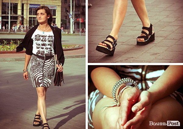 Сама по собі і футболка, і спідниця досить цікаві, але разом вони створюють дисгармонію. Адже і там, і там є свій принт. Їх не варто поєднувати, потрібно залишити лише одну з цих речей. Спідниця краще виглядала б з однотонною майкою без принта. Мені подобається її сумка. У піджака дуже цікавий крій, у нього немає коміру та є потрійні складки. Крім того, він може, як рівно лежати, так і розводитись у сторони. Іра обрала дуже зручне взуття. Така мʼяка товста підошва ніколи не викликатиме дискомфорту.