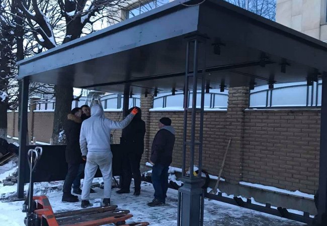 Він опублікував світлину, на якій видно, що роботи зі встановлення скляної конструкції тривають на зупинці поблизу ЦУМа.
