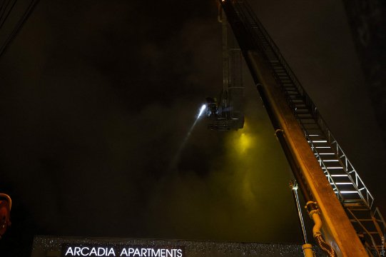 Гасіння пожежі ускладнене двома факторами. По-перше, будинок знаходиться в глибині щільної забудови. Пожежники заливають вогонь з автовишки, яку підняли на Посмітного. По-друге, пожежникам важко працювати через низьку температуру. Бризки моментально замерзають на їх костюмах.