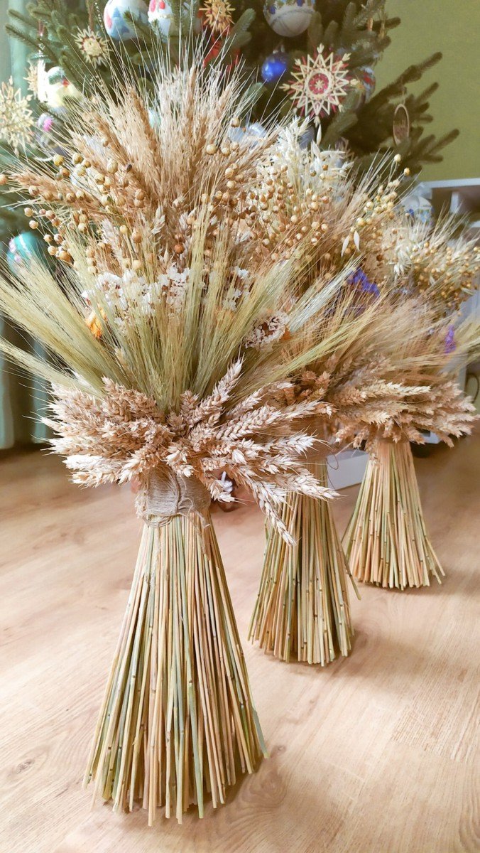Кожну стеблину слід очистити від листя, колосся висушити на сонці, де воно дійде до свого натурального кольору – трохи висвітлиться. Цього року заготовила і стебла промислового льону із коробочками з насінням, вони гарно виглядають у зв’язці. Улітку також треба підготувати й квіти, які прикрасять майбутнього дідуха. Для цього підходять усі різновиди родини кермекових, інші сухоцвіти. Пробувала застосовувати й звичайні лугові трави, але вони сильно обсипаються, торік дідухи також прикрашала яскравими кетягами калини.