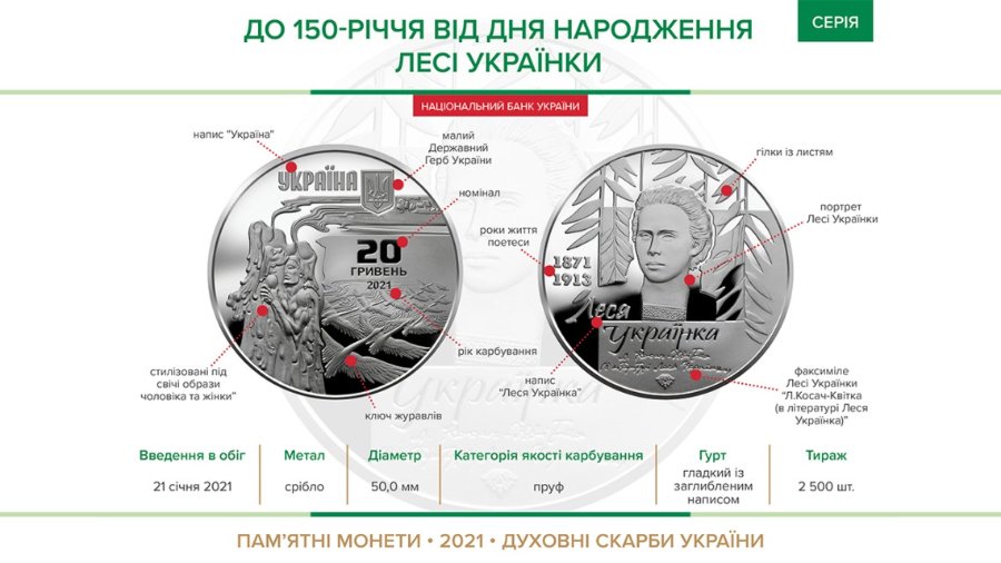 Як повідомили у пресслужбі Нацбанку, монету з серії «Духовні скарби України» присвятили письменниці, громадській діячці Лесі Українці (Ларисі Петрівні Косач).