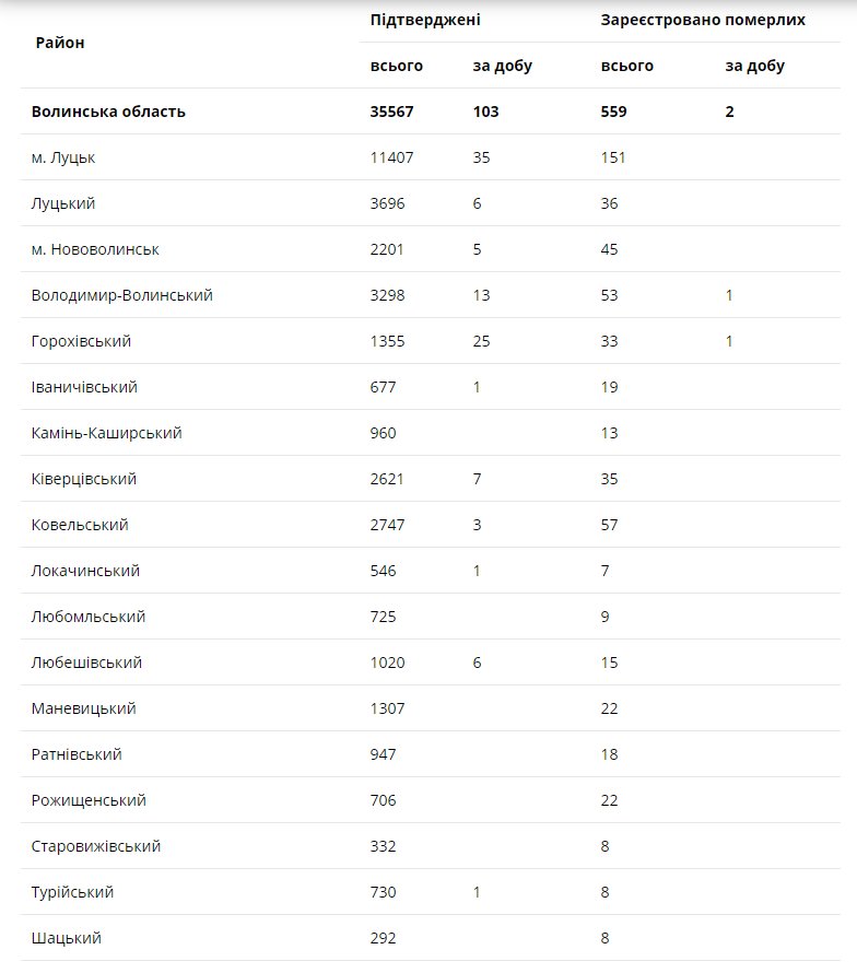За останню добу на Волині зареєстрували 103 нових підтверджених випадки коронавірусної хвороби COVID-19. Одужало за добу 152 особи, летальних випадків – 2.