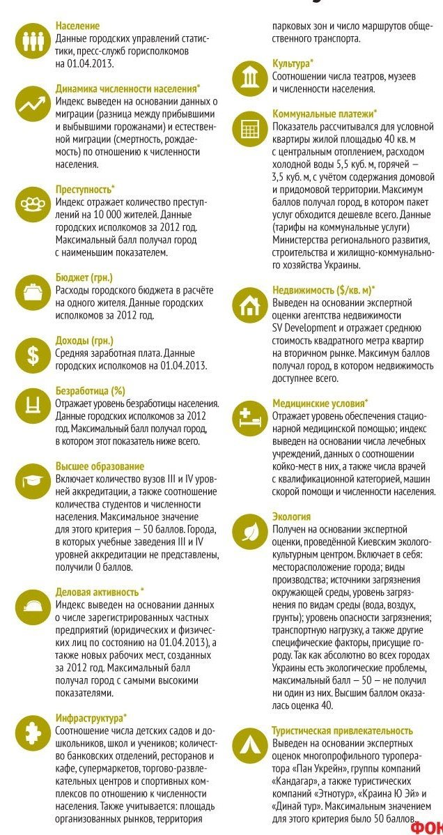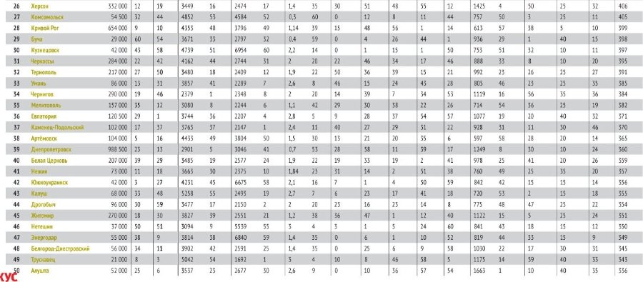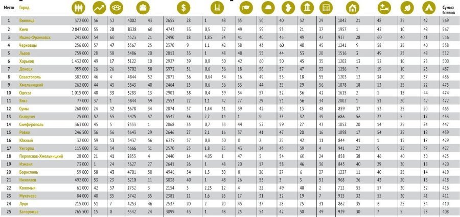 Загалом у рейтингу майже третина ‒ міста Західної України. Як правило, там досить скромні доходи, зате добре з екологією, інфраструктурою, а також низький рівень злочинності. Забезпеченість і ділова активність східноукраїнських промислових центрів зовсім не означає, що там благополучно з усім іншим: у рейтингу таких всього сім.