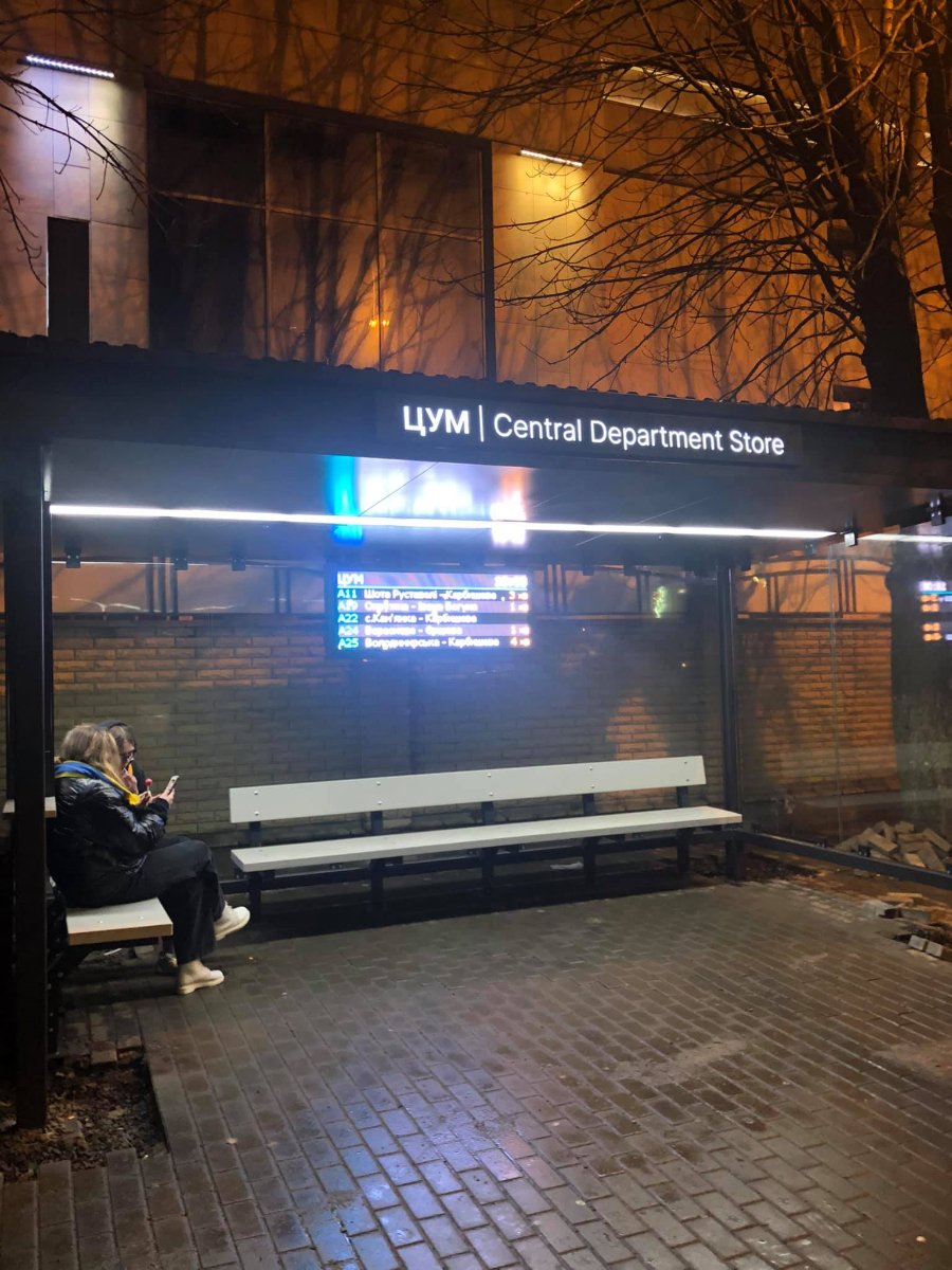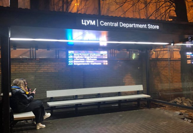 Зупинка обладнана підсвіткою, інформаційним табло, відеокамерою, WI-FI, сітілайтом та контейнерами для роздільного збору сміття.