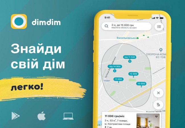 У dimdim.ua є також своє власний мобільний додаток з унікальною функцією – пошук житла по карті. Достатньо лише обвести на карті район, що вас цікавить, а також задати пріоритетні значення по фільтрам (ціна, кількість кімнат, поверх та ін.), після чого на ній з'являються сині маркери з відмітками цін за оренду відповідного за параметрами житла.