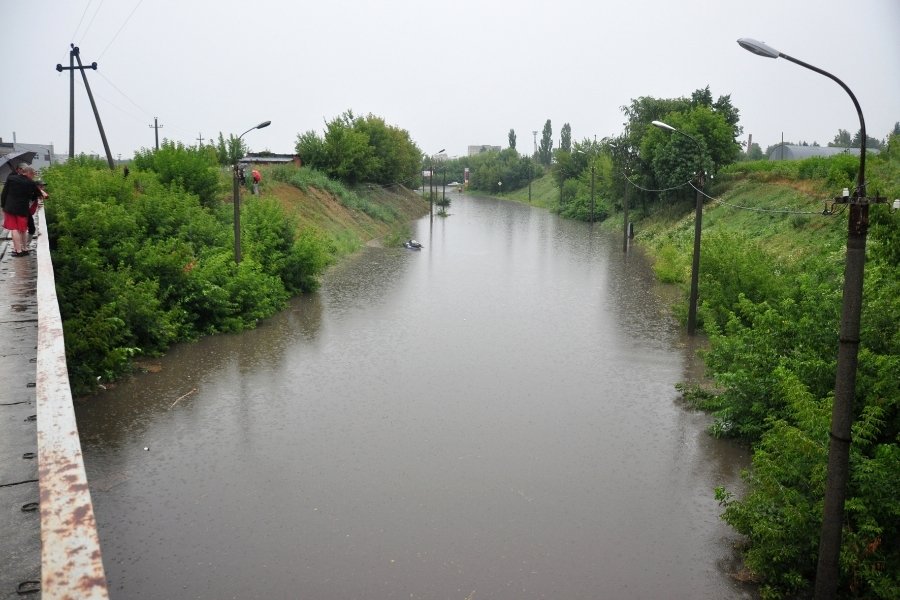 Водій одного з автомобілів покинув свій транспорт у величезній калюжі, яка утворилася через негоду на вулиці Карпенка-Карого.
