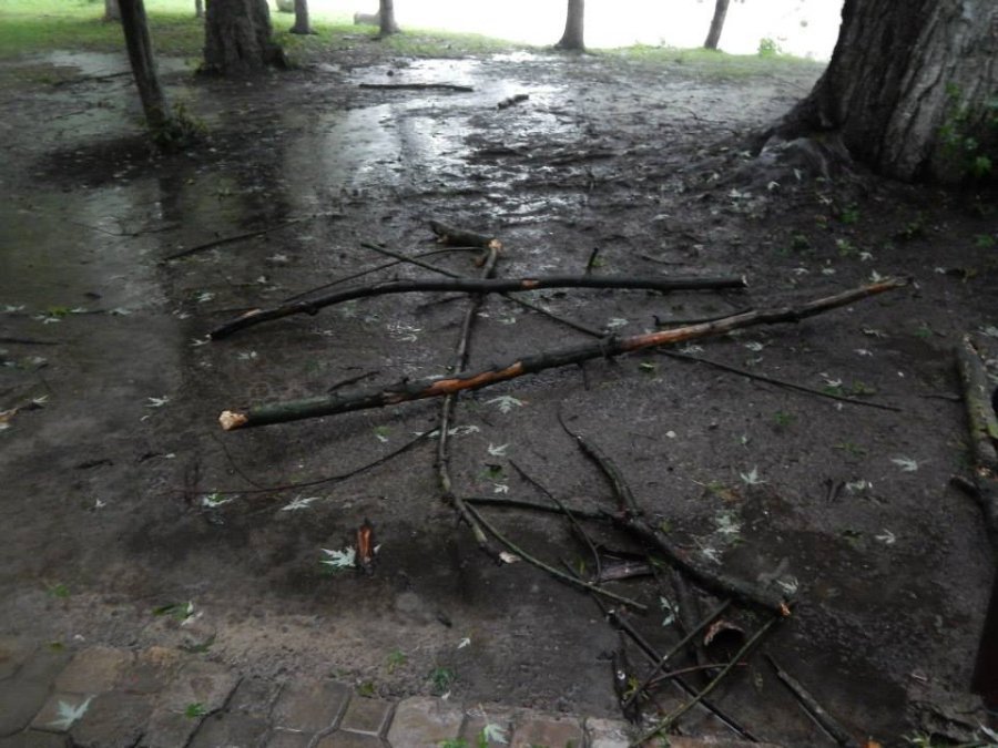 "Калюжі по коліна були біля вольєрів левів, вепрів та вовків. Вітер ламав гілки старих дерев і молоді деревця. Із літніх вольєрів довелося евакуювати курей, курчат і павичів. Залишили там лише наше гусенятко. Боня всівся посеред великої калюжі і видно, що почувався досить комфортно. Так само, як і всі наші водоплавні – лебеді, гуси та качки", - кажуть у зоопарку.