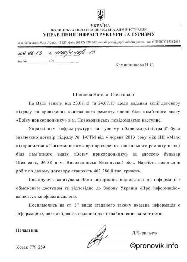 В управлінні інфраструктури та туризму їй надали лише загальну інформацію щодо ремонту об'єкту. Решту інформації чиновники відмовилися надати. Мовляв, вона - конфіденційна.