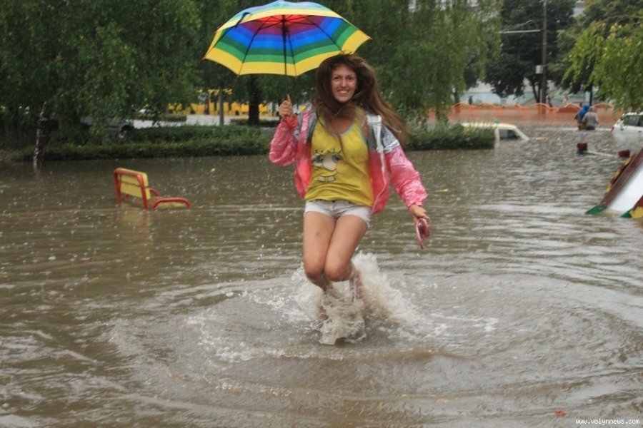 Оптимістично налаштовані лучани бавились, наче діти, стрибали по калюжах, гойдались на гойдалках, змагались «хто далі пропливе» по дорозі. Інші – фотографували та знімали усе на відео.