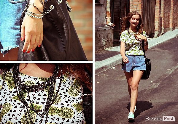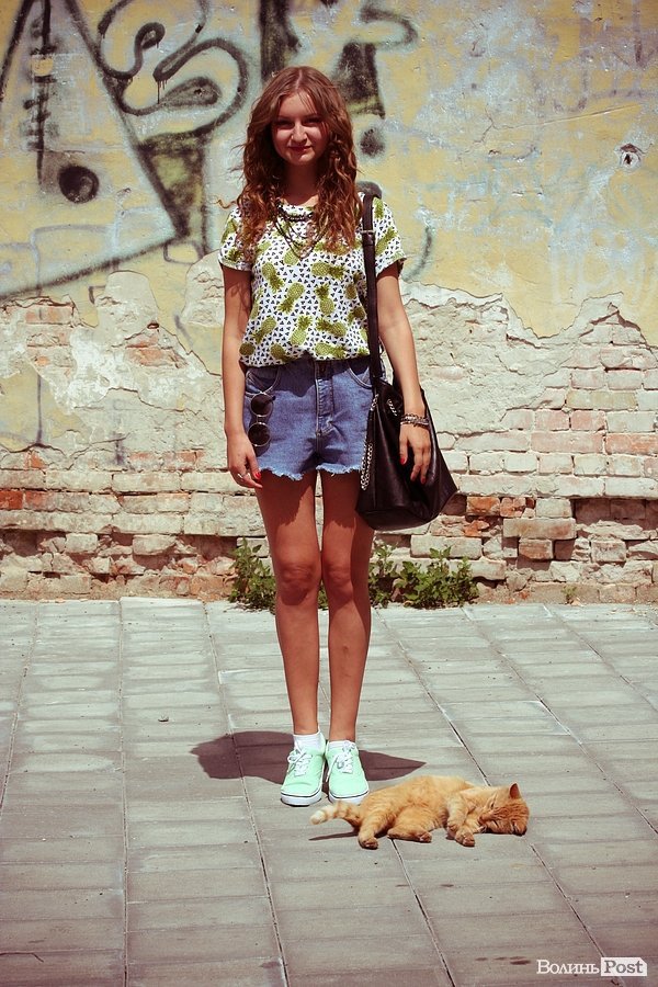 Такі високі джинсові шорти були на піку популярності в Америці 80-х. Сьогодні вони знову в тренді. Зроблені зі старих маминих джинсів, вони ще тісніше повʼязані з тим часом. Хороший літній кежуал ‒ кеди, джинсові шорти та легка майка. Ольга відповідає вимогам за усіма параметрами. Крім того, вона додала до цього свої улюблені аксесуари ‒ перстень, ланцюжки та окуляри. Вийшло досить непогано ‒ стильно і відповідно температурі за вікном. Далі Ольга розповідає про себе сама.