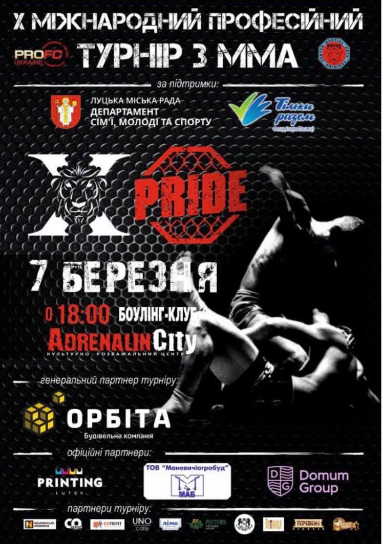 У Луцьку 7 березня в боулінг-клубі «Адреналін» відбудеться X Міжнародний професійний турнір з ММА «PRIDE» Ліги ММА «PROFC-Ukraine».