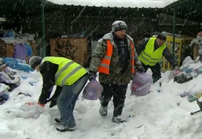 Аби комунальники могли дістатися до сміттєвих баків та прибрати відходи, допомагає розчищати дороги спецтехніка, каже вантажник Леонід Захожий. Подекуди сміттєвих контейнерів й не видно через снігопад.