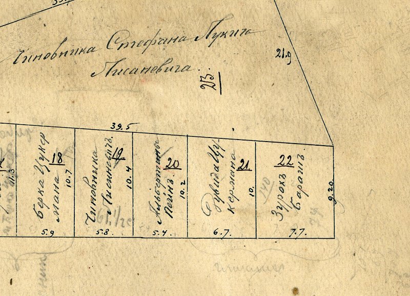 Тобто якщо підходити формально, то будинок і справді виліз на тротуари порівняно з тим, якими ці тротуари фігурують у плані вулиці 1869, але тоді треба врахувати, що так з усіма будинками. Підрахували, що знесення стін, які порушили кордони, і зведення нових може обійтися власнику у суму 6000 рублів.