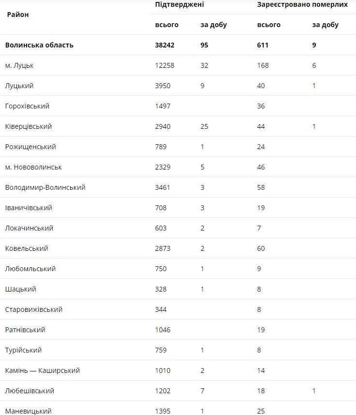 За останню добу на Волині зареєстрували 95 нових підтверджених випадків коронавірусної хвороби COVID-19 (з них дітей – 7, медпрацівників — 11).