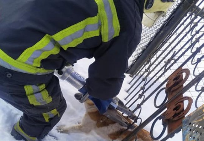 Чотирилапий застряг у металевій секції паркану. Для порятунку тваринки бійці ДСНС застосували спеціальний інструмент.