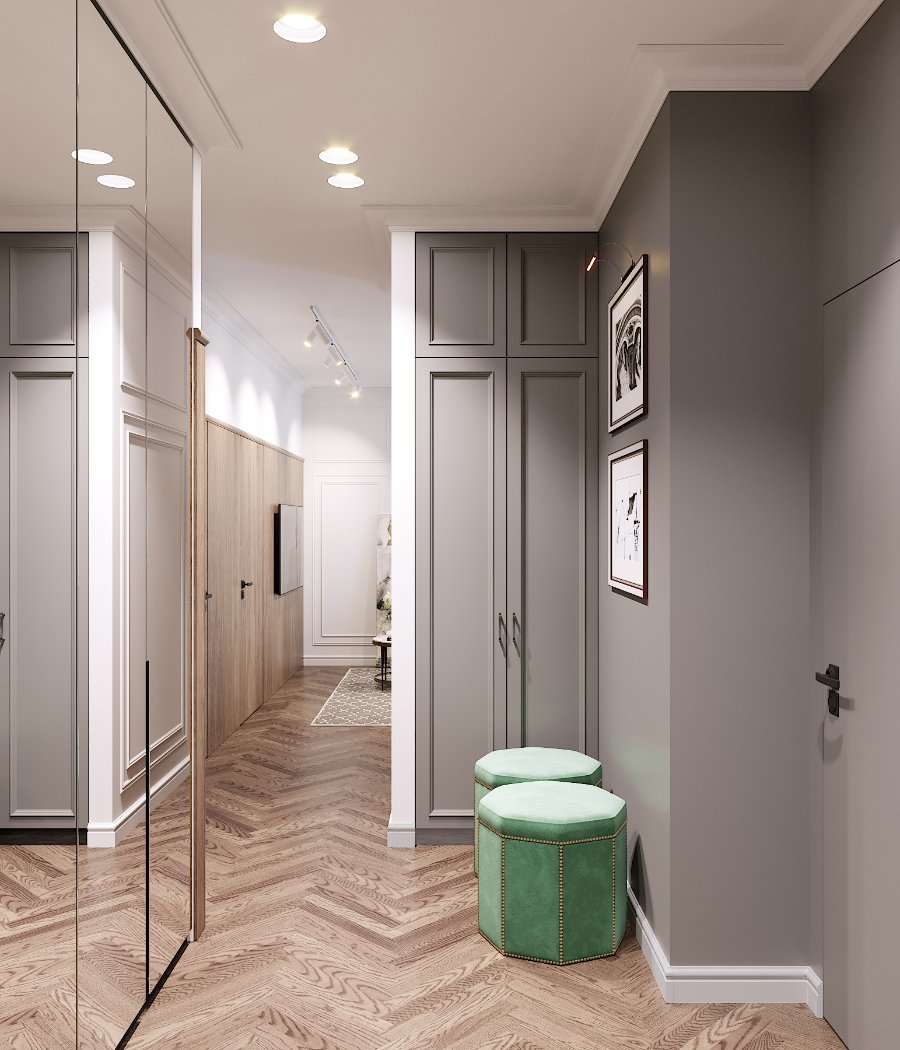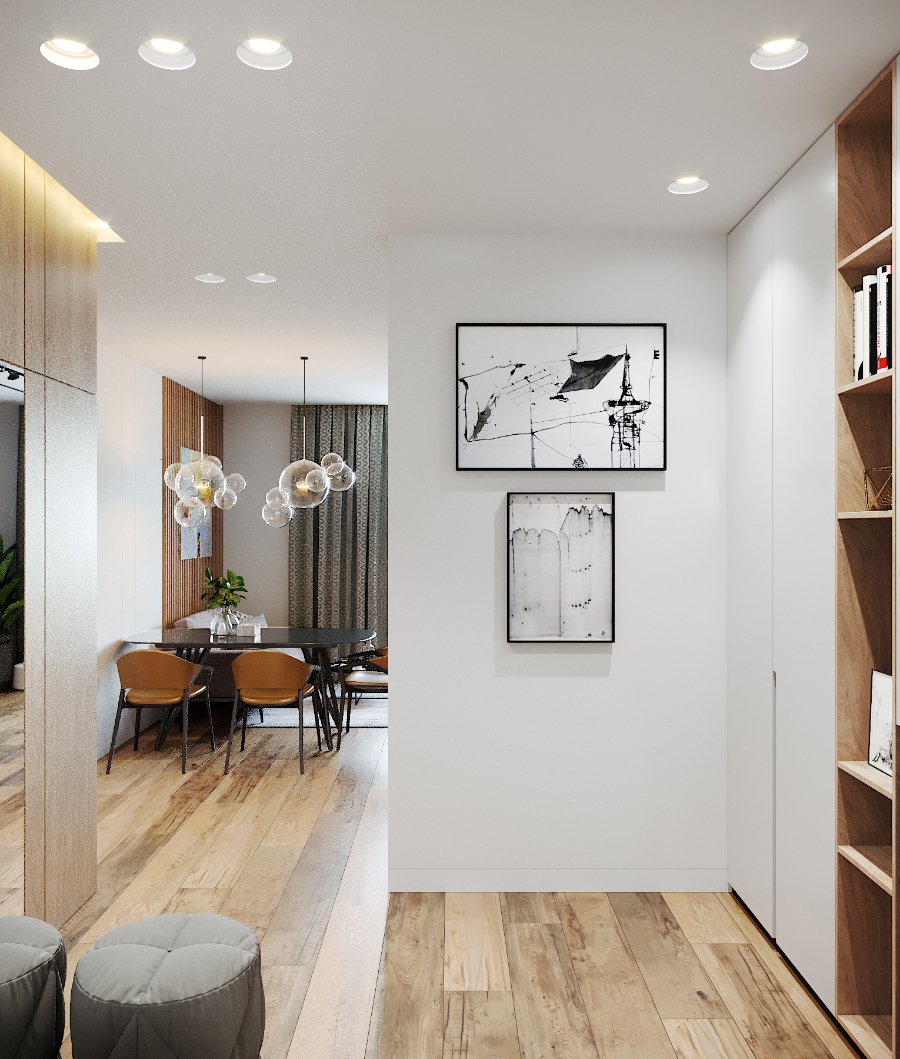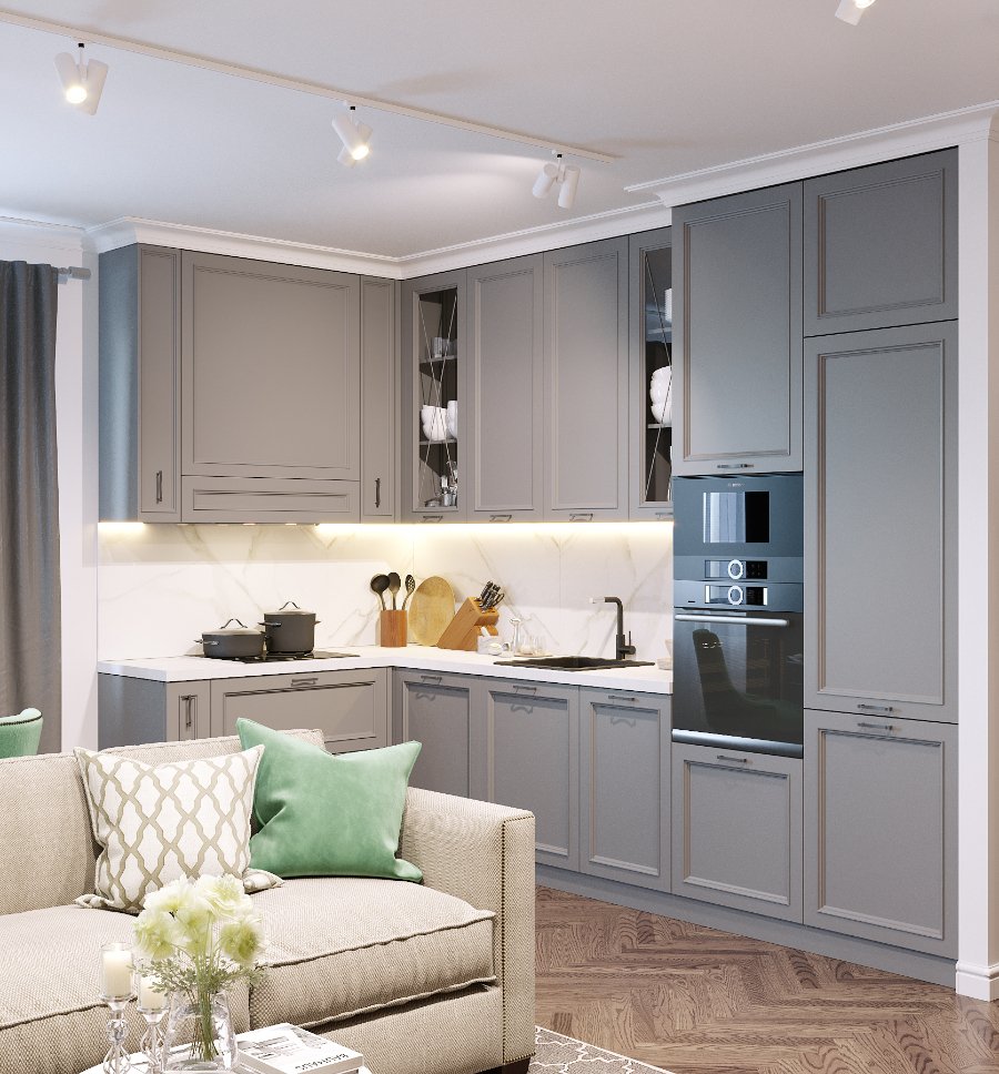 Ще один варіант дизайну кухні-студії від PANDA - із кутовим гарнітуром. Зона приготування їжі тут займає мінімальну площу, а вітальня фактично об’єднана із коридором за рахунок прихованих дверей.