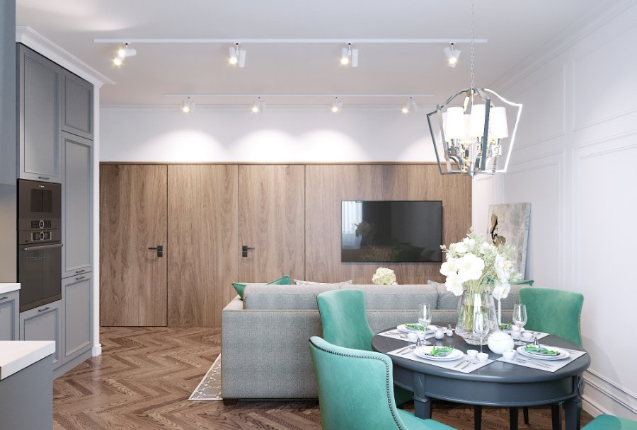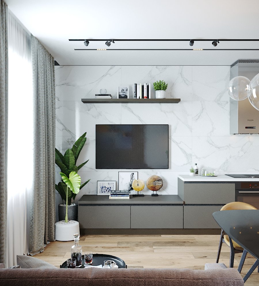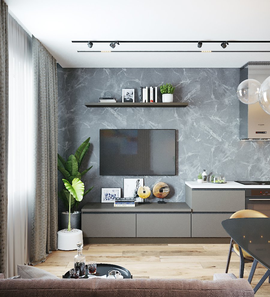 В одному із дизайнів немає візуального поділу на зони. Вздовж однієї стіни запропонували розташувати телевізор, тумба під яким переходить в кухонний гарнітур. Навпроти телевізора - диван, поруч - стіл із стільцями. Такий варіант кухні-студії найкраще підійде для людей, які звикли поєднувати прийом їжі та її приготування із переглядом телевізора чи іншим відпочинком.