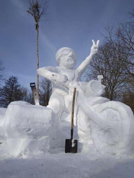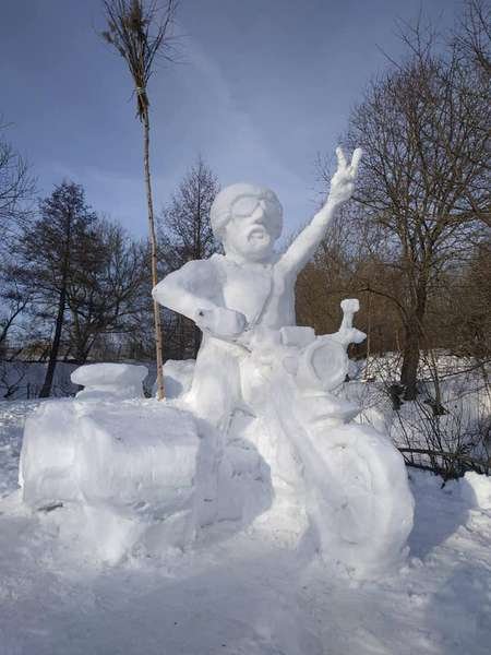 У Рокинях неподалік джерела з’явилась снігова скульптура у вигляді байкера. Величезну скульптуру зі снігу змайстрував вчитель образотворчого мистецтва місцевої школи Василь Мішко.