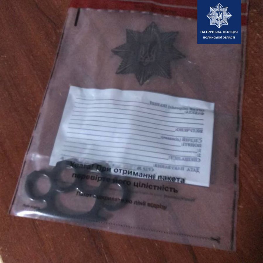 Цієї ж ночі, патрульні із роти тактико-оперативного реагування під час віпрацювання виклику «домашнє насильство» відшукали особу, на яку вказала заявниця. У 20-річного чоловіка під час превентивного заходу поверхневої перевірки, відповідно до ст. 34 Закону України «Про Національну поліцію», виявили металевий предмет, зовні схожий на каскет.